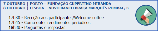 QUAL DESTAS 3 OPÇÕES PROCURA?  | Crescimento sustentável do seu rendimento |  | Mais estabilidade e menor volatilidade |  | Liquidez com maior frequência | Assinalou as 3? Então faça check-in no próximo seminário do Banco Best. Nos próximos dias 7 e 8 de outubro, terá a oportunidade de ficar a conhecer as vantagens de rentabilizar o seu investimento através da combinação básica de ativos para conseguir rendimentos atrativos e ajustados ao risco. Escolha a sua cidade e reserve o seu lugar numa das sessões que contam com a participação exclusiva da sociedade gestora Fidelity. |  Participação livre | Lotação limitada. | Para anular a subscrição da nossa base de dados, clique aqui: http://web0.newsletters.xl.pt/mail.cgi/t/EPEYwpOKjCSVtuNSrnQZWaAEPpzuDUdGhEdoqeaM/ | |
